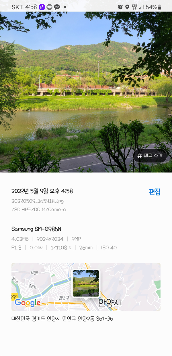 갤러리 앱에서 사진 선택 후, 오른쪽 하단의 더보기(점 3개) 버튼을 클릭 > 상세정보를 클릭하면 위 이미지와 같이 사진 하단에 내가 찍었던 사진의 장소가 구글 지도에 표시되고 상세한 주소까지 나온다.