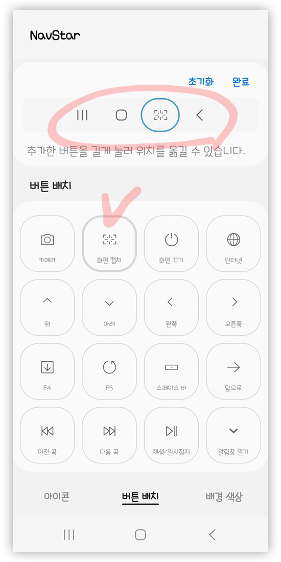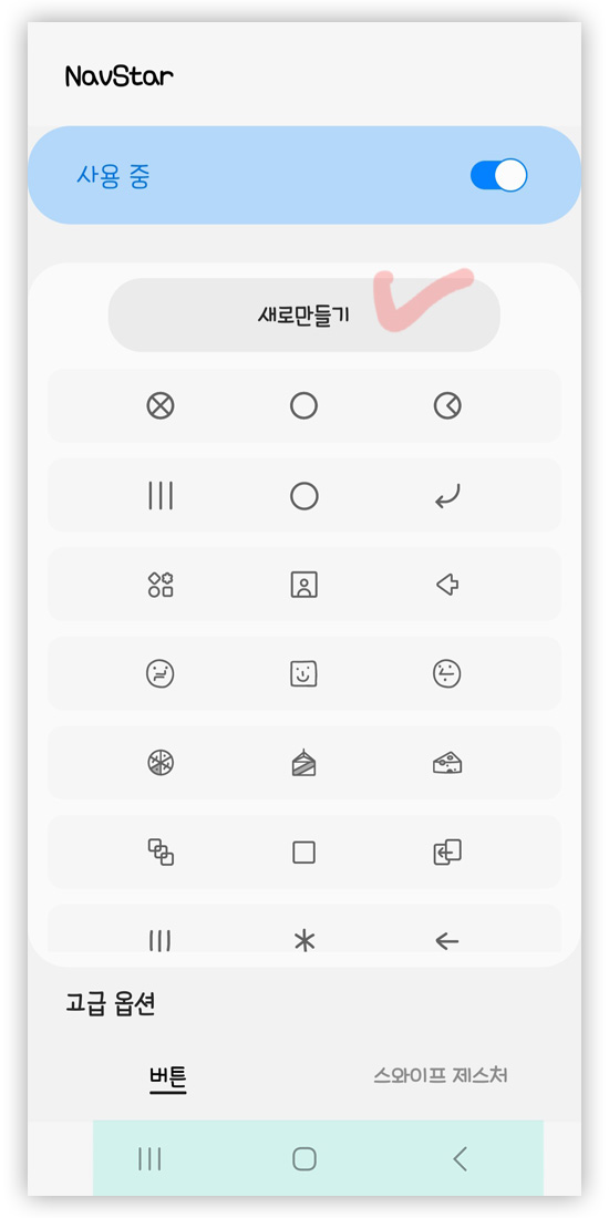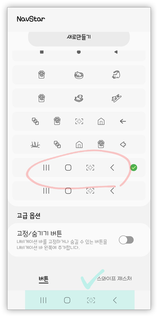 6. 다시 새로 만들기 화면으로 돌아오면 하단에 내가 만든 (캡쳐 버튼이 추가된) 하단바가 저장된 것이 보인다.