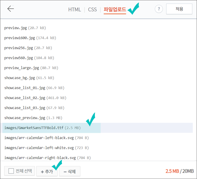 업로드 후, 상단에 있는 [적용]을 눌러줘야 파일이 저장된다.