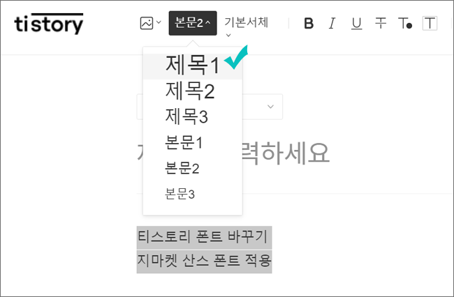 티스토리에서는 본문 제목을 나타낼 때, 위에 제목 1~3 중에서 선택해서 사용한다.