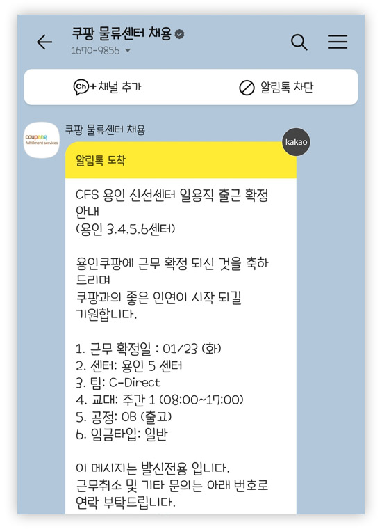 - 첫 출근 시, 쿠펀치 앱에 계좌번호를 등록하라고 안내되어 있다.