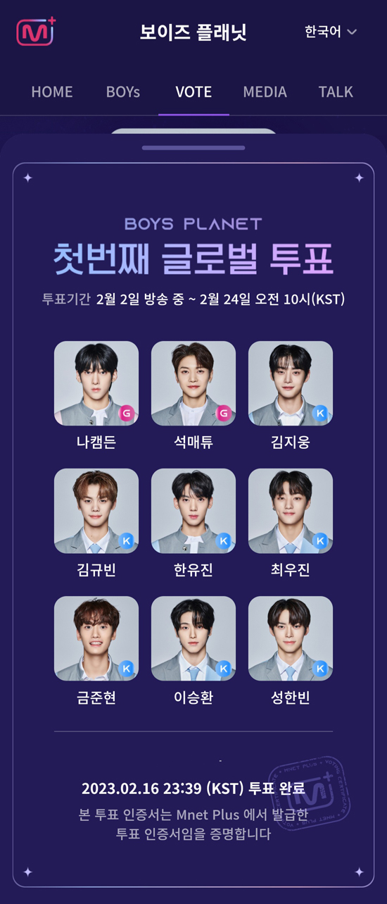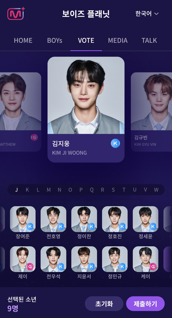 K그룹 G그룹 구분없이 9명을 선택해서 투표 할 수 있다.